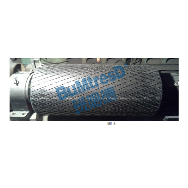 人字形溝槽鑄(包)膠滾筒(如圖5)是在鋼制光面滾筒表面,加一層帶人字溝槽的橡膠層,這樣可以大大增加皮帶和滾筒之間的摩擦系數(shù)。在潮濕環(huán)境中,溝槽能使水的薄膜中斷,不積水,同時(shí)輸送帶與滾筒接觸時(shí),輸送帶表面能擠壓到溝槽里,由于這兩各原因,即使在潮濕的場(chǎng)合工作,摩擦系數(shù)降低也很小。但這種滾筒運(yùn)行方向?yàn)槿俗中畏较颍坏梅聪蜻\(yùn)轉(zhuǎn)。