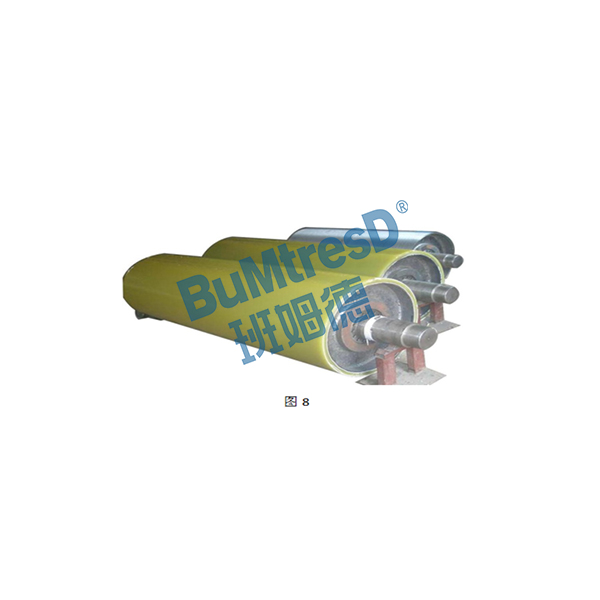 聚氨酯滾筒(如圖8)是在金屬滾筒上附一層聚氨酯包膠,聚氨酯層能有效的改善輸送系統(tǒng)的運(yùn)行狀況,保護(hù)金屬滾筒不被磨損,增大阻力,阻止輸送帶打滑,聚氨酯滾筒的耐磨性要明顯優(yōu)于其它滾筒。