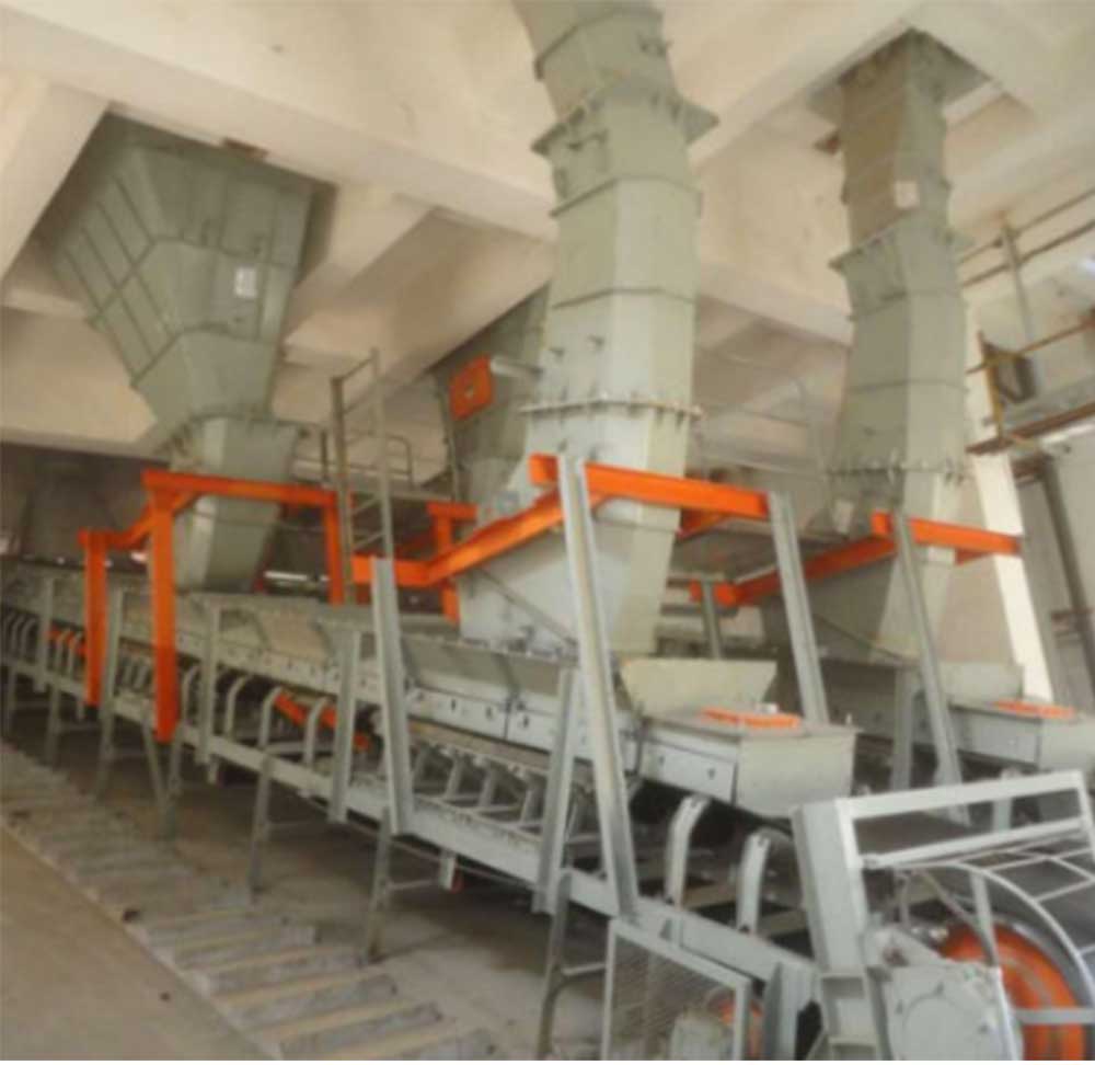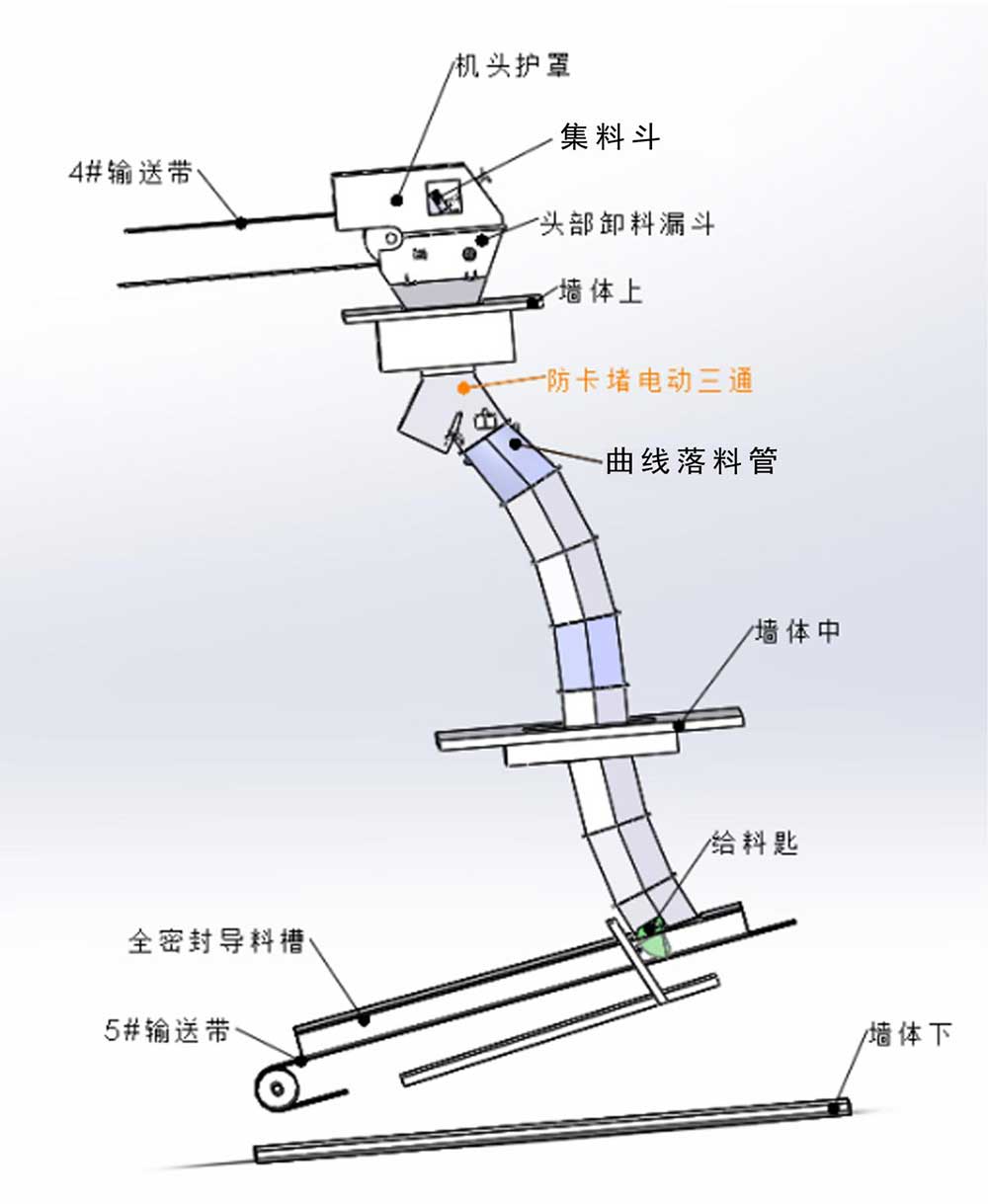 2、流線型的曲線落料管,減小料流與落料管壁之間的沖擊角,減少了濕煤、粘煤的堵塞幾率,保證安全正常生產(chǎn)。